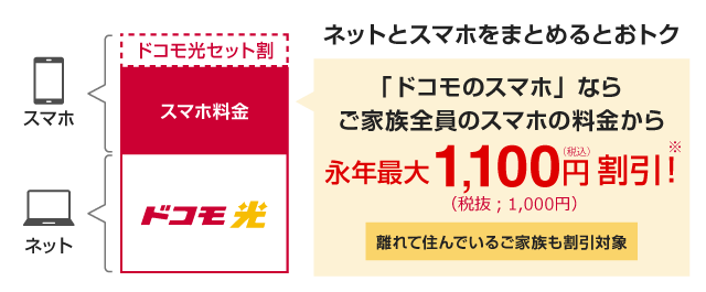 ドコモのケータイ回線と「ドコモ光」をセット(「ファミリー割引」グループやシェアグループで「ドコモ光」をセットでご契約いただいている回線がある場合を含む)でご契約いただいている状態において、ケータイ回線の基本使用料またはパケットパック定額料を割り引くサービスです。割引適用後の月額料金